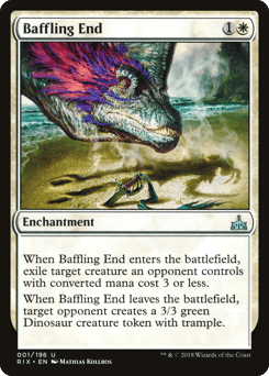 When this enchantment enters, exile target creature an opponent controls with mana value 3 or less. When this enchantment leaves the battlefield, target opponent creates a 3/3 green Dinosaur creature token with trample.