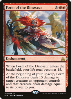 When this enchantment enters, your life total becomes 15. At the beginning of your upkeep, this enchantment deals 15 damage to target creature an opponent controls and that creature deals damage equal to its power to you.