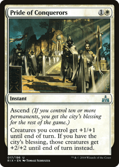 Ascend (If you control ten or more permanents, you get the city's blessing for the rest of the game.) Creatures you control get +1/+1 until end of turn. If you have the city's blessing, those creatures get +2/+2 until end of turn instead.