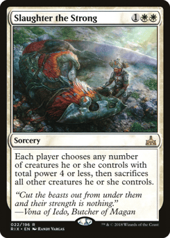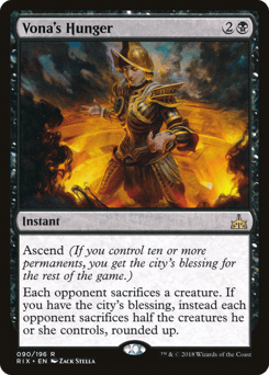 Ascend (If you control ten or more permanents, you get the city's blessing for the rest of the game.) Each opponent sacrifices a creature of their choice. If you have the city's blessing, instead each opponent sacrifices half the creatures they control of their choice, rounded up.