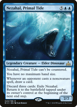 This spell can't be countered. You have no maximum hand size. Whenever an opponent casts a noncreature spell, draw a card. Discard three cards: Exile Nezahal. Return it to the battlefield tapped under its owner's control at the beginning of the next end step.