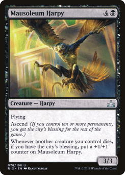 Flying Ascend (If you control ten or more permanents, you get the city's blessing for the rest of the game.) Whenever another creature you control dies, if you have the city's blessing, put a +1/+1 counter on this creature.