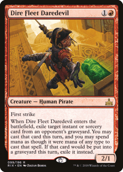 First strike When this creature enters, exile target instant or sorcery card from an opponent's graveyard. You may cast it this turn, and mana of any type can be spent to cast that spell. If that spell would be put into a graveyard, exile it instead.