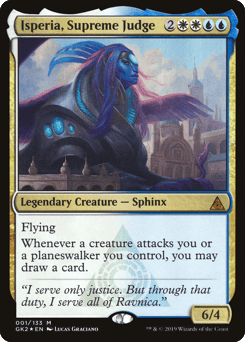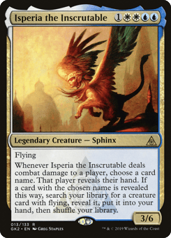 Flying Whenever Isperia deals combat damage to a player, choose a card name. That player reveals their hand. If a card with the chosen name is revealed this way, search your library for a creature card with flying, reveal it, put it into your hand, then shuffle.