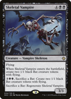Flying When this creature enters, create two 1/1 black Bat creature tokens with flying. {3}{B}{B}, Sacrifice a Bat: Create two 1/1 black Bat creature tokens with flying. Sacrifice a Bat: Regenerate this creature.