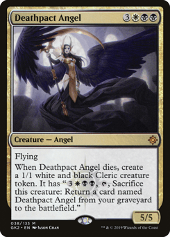 Flying When this creature dies, create a 1/1 white and black Cleric creature token. It has "{3}{W}{B}{B}, {T}, Sacrifice this token: Return a card named Deathpact Angel from your graveyard to the battlefield."