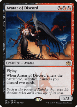({B/R} can be paid with either {B} or {R}.) Flying When this creature enters, sacrifice it unless you discard two cards.