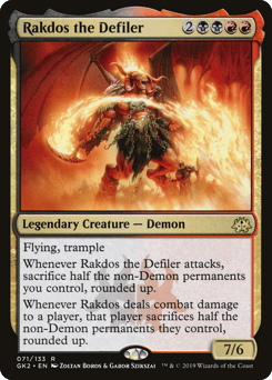 Flying, trample Whenever Rakdos attacks, sacrifice half the non-Demon permanents you control, rounded up. Whenever Rakdos deals combat damage to a player, that player sacrifices half the non-Demon permanents they control of their choice, rounded up.