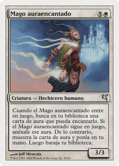When this creature enters, search your library for an Aura card that could enchant it. If this creature is still on the battlefield, put that Aura card onto the battlefield attached to it. Otherwise, reveal the Aura card and put it into your hand. Then shuffle.