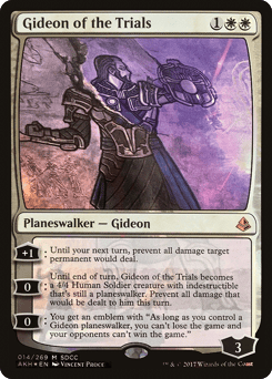[+1]: Until your next turn, prevent all damage target permanent would deal. [0]: Until end of turn, Gideon becomes a 4/4 Human Soldier creature with indestructible that's still a planeswalker. Prevent all damage that would be dealt to him this turn. [0]: You get an emblem with "As long as you control a Gideon planeswalker, you can't lose the game and your opponents can't win the game."