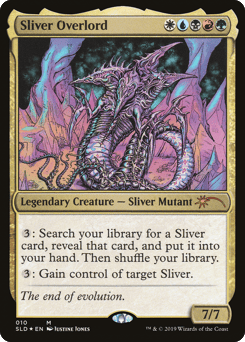 {3}: Search your library for a Sliver card, reveal that card, put it into your hand, then shuffle. {3}: Gain control of target Sliver. (This effect lasts indefinitely.)