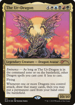 Eminence — As long as The Ur-Dragon is in the command zone or on the battlefield, other Dragon spells you cast cost {1} less to cast. Flying Whenever one or more Dragons you control attack, draw that many cards, then you may put a permanent card from your hand onto the battlefield.