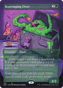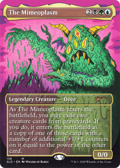 As The Mimeoplasm enters, you may exile two creature cards from graveyards. If you do, it enters as a copy of one of those cards with a number of additional +1/+1 counters on it equal to the power of the other card.
