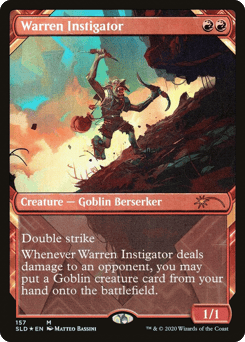 Whenever this creature deals damage to a player, you may put a Goblin permanent card from your hand onto the battlefield.