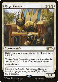 Other Cats you control get +1/+1 and have lifelink. (Damage dealt by those creatures also causes you to gain that much life.) When this creature enters, create two 1/1 white Cat creature tokens with lifelink.
