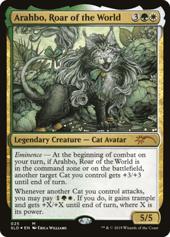 Eminence — At the beginning of combat on your turn, if Arahbo is in the command zone or on the battlefield, another target Cat you control gets +3/+3 until end of turn. Whenever another Cat you control attacks, you may pay {1}{G}{W}. If you do, it gains trample and gets +X/+X until end of turn, where X is its power.