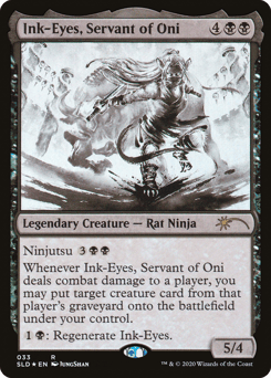 Ninjutsu {3}{B}{B} ({3}{B}{B}, Return an unblocked attacker you control to hand: Put this card onto the battlefield from your hand tapped and attacking.) Whenever Ink-Eyes deals combat damage to a player, you may put target creature card from that player's graveyard onto the battlefield under your control. {1}{B}: Regenerate Ink-Eyes.