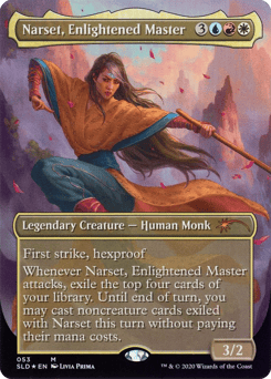 First strike, hexproof Whenever Narset attacks, exile the top four cards of your library. Until end of turn, you may cast noncreature spells from among those cards without paying their mana costs.