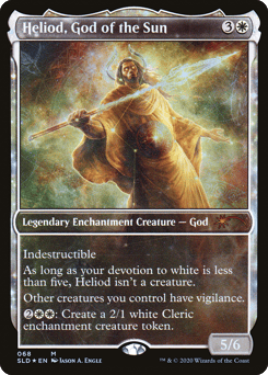 Indestructible As long as your devotion to white is less than five, Heliod isn't a creature. (Each {W} in the mana costs of permanents you control counts toward your devotion to white.) Other creatures you control have vigilance. {2}{W}{W}: Create a 2/1 white Cleric enchantment creature token.