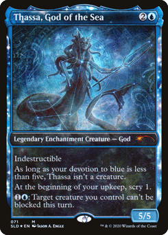 Indestructible As long as your devotion to blue is less than five, Thassa isn't a creature. (Each {U} in the mana costs of permanents you control counts toward your devotion to blue.) At the beginning of your upkeep, scry 1. {1}{U}: Target creature you control can't be blocked this turn.