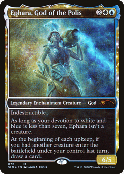 Indestructible As long as your devotion to white and blue is less than seven, Ephara isn't a creature. At the beginning of each upkeep, if you had another creature enter the battlefield under your control last turn, draw a card.