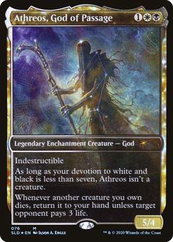 Indestructible As long as your devotion to white and black is less than seven, Athreos isn't a creature. Whenever another creature you own dies, return it to your hand unless target opponent pays 3 life.
