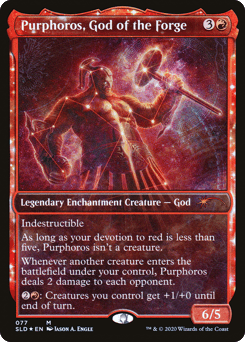 Indestructible As long as your devotion to red is less than five, Purphoros isn't a creature. Whenever another creature you control enters, Purphoros deals 2 damage to each opponent. {2}{R}: Creatures you control get +1/+0 until end of turn.