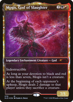 Indestructible As long as your devotion to black and red is less than seven, Mogis isn't a creature. At the beginning of each opponent's upkeep, Mogis deals 2 damage to that player unless they sacrifice a creature of their choice.