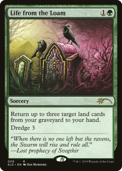 Return up to three target land cards from your graveyard to your hand. Dredge 3 (If you would draw a card, you may mill three cards instead. If you do, return this card from your graveyard to your hand.)