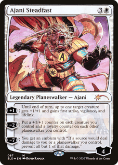 [+1]: Until end of turn, up to one target creature gets +1/+1 and gains first strike, vigilance, and lifelink. [−2]: Put a +1/+1 counter on each creature you control and a loyalty counter on each other planeswalker you control. [−7]: You get an emblem with "If a source would deal damage to you or a planeswalker you control, prevent all but 1 of that damage."