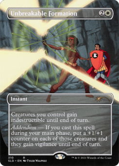 Creatures you control gain indestructible until end of turn. Addendum — If you cast this spell during your main phase, put a +1/+1 counter on each of those creatures and they gain vigilance until end of turn.