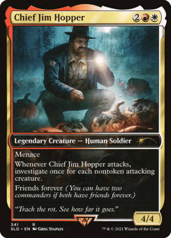 When Wernog, Rider's Chaplain enters or leaves the battlefield, each opponent may investigate. Each opponent who doesn't loses 1 life. You investigate X times, where X is one plus the number of opponents who investigated this way. Partner—Friends forever (You can have two commanders if both have this ability.)