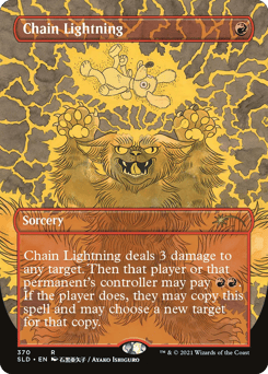 Chain Lightning deals 3 damage to any target. Then that player or that permanent's controller may pay {R}{R}. If the player does, they may copy this spell and may choose a new target for that copy.