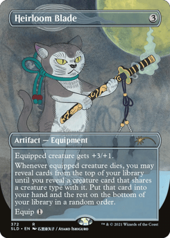Equipped creature gets +3/+1. Whenever equipped creature dies, you may reveal cards from the top of your library until you reveal a creature card that shares a creature type with it. Put that card into your hand and the rest on the bottom of your library in a random order. Equip {1}