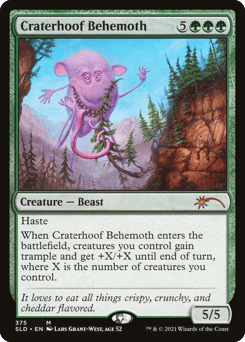 Haste When this creature enters, creatures you control gain trample and get +X/+X until end of turn, where X is the number of creatures you control.