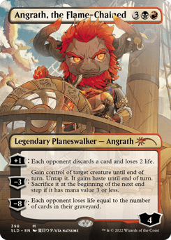 [+1]: Each opponent discards a card and loses 2 life. [−3]: Gain control of target creature until end of turn. Untap it. It gains haste until end of turn. Sacrifice it at the beginning of the next end step if it has mana value 3 or less. [−8]: Each opponent loses life equal to the number of cards in their graveyard.