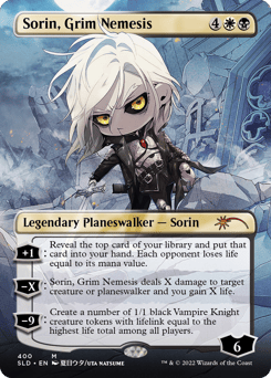 [+1]: Reveal the top card of your library and put that card into your hand. Each opponent loses life equal to its mana value. [−X]: Sorin deals X damage to target creature or planeswalker and you gain X life. [−9]: Create a number of 1/1 black Vampire Knight creature tokens with lifelink equal to the highest life total among all players.