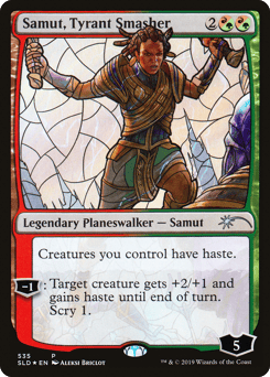 Creatures you control have haste. [−1]: Target creature gets +2/+1 and gains haste until end of turn. Scry 1.