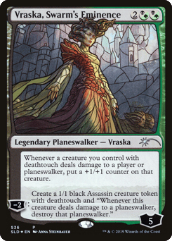 Whenever a creature you control with deathtouch deals damage to a player or planeswalker, put a +1/+1 counter on that creature. [−2]: Create a 1/1 black Assassin creature token with deathtouch and "Whenever this token deals damage to a planeswalker, destroy that planeswalker."