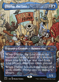When Fblthp enters, draw a card. If it entered from your library or was cast from your library, draw two cards instead. When Fblthp becomes the target of a spell, shuffle Fblthp into its owner's library.