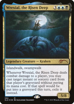 Islandwalk, swampwalk (This creature can't be blocked as long as defending player controls an Island or a Swamp.) Whenever Wrexial deals combat damage to a player, you may cast target instant or sorcery card from that player's graveyard without paying its mana cost. If that spell would be put into a graveyard, exile it instead.