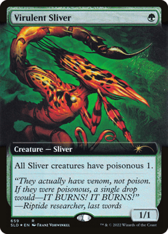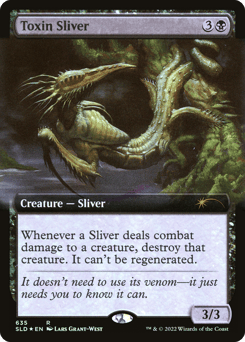 All Sliver creatures have poisonous 1. (Whenever a Sliver deals combat damage to a player, that player gets a poison counter. A player with ten or more poison counters loses the game.)