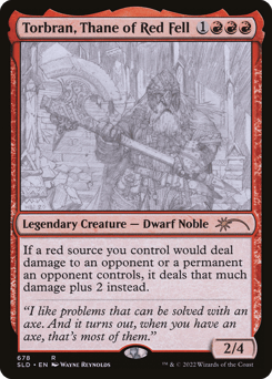 If a red source you control would deal damage to an opponent or a permanent an opponent controls, it deals that much damage plus 2 instead.