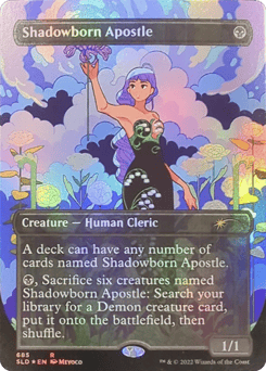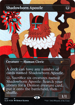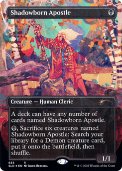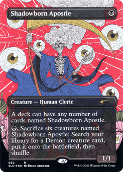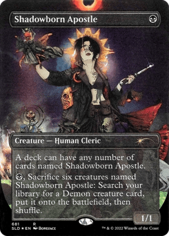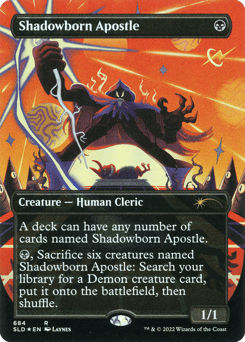 A deck can have any number of cards named Shadowborn Apostle. {B}, Sacrifice six creatures named Shadowborn Apostle: Search your library for a Demon creature card, put it onto the battlefield, then shuffle.