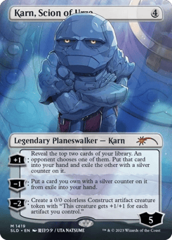 [+1]: Reveal the top two cards of your library. An opponent chooses one of them. Put that card into your hand and exile the other with a silver counter on it. [−1]: Put a card you own with a silver counter on it from exile into your hand. [−2]: Create a 0/0 colorless Construct artifact creature token with "This token gets +1/+1 for each artifact you control."