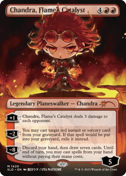 [+1]: Chandra deals 3 damage to each opponent. [−2]: You may cast target red instant or sorcery card from your graveyard. If that spell would be put into your graveyard, exile it instead. [−8]: Discard your hand, then draw seven cards. Until end of turn, you may cast spells from your hand without paying their mana costs.