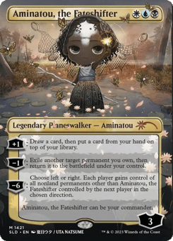 [+1]: Draw a card, then put a card from your hand on top of your library. [−1]: Exile another target permanent you own, then return it to the battlefield under your control. [−6]: Choose left or right. Each player gains control of all nonland permanents other than Aminatou controlled by the next player in the chosen direction. Aminatou, the Fateshifter can be your commander.