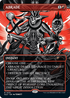 Choose one — • Abrade deals 3 damage to target creature. • Destroy target artifact.