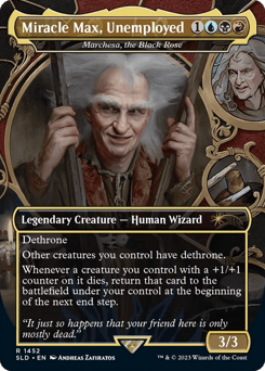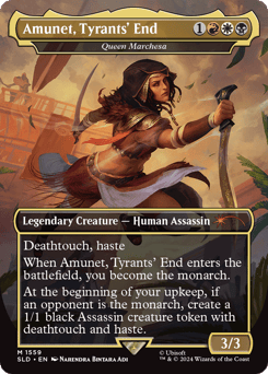 Deathtouch, haste When Queen Marchesa enters, you become the monarch. At the beginning of your upkeep, if an opponent is the monarch, create a 1/1 black Assassin creature token with deathtouch and haste.