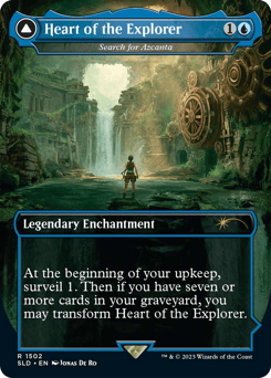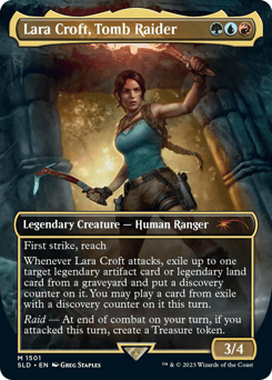 First strike, reach Whenever Lara Croft attacks, exile up to one target legendary artifact card or legendary land card from a graveyard and put a discovery counter on it. You may play a card from exile with a discovery counter on it this turn. Raid — At end of combat on your turn, if you attacked this turn, create a Treasure token.